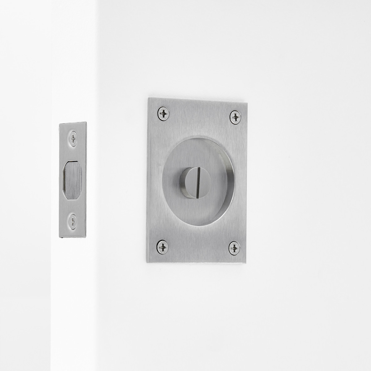 The C-62L-SET Privacy Lockset is a comprehensive lock and flush pull system crafted with precision and attention to detail. This set includes modern 2 3/8 in [60.3 mm] by 3 1/4 in [82.6 mm] flush pulls and a thumb turn. The emergency release coin turn provides an added layer of safety by allowing the door to be unlocked quickly and easily from the outside. This lockset is available in a variety of architectural finishes, with the option for custom finishing available.
