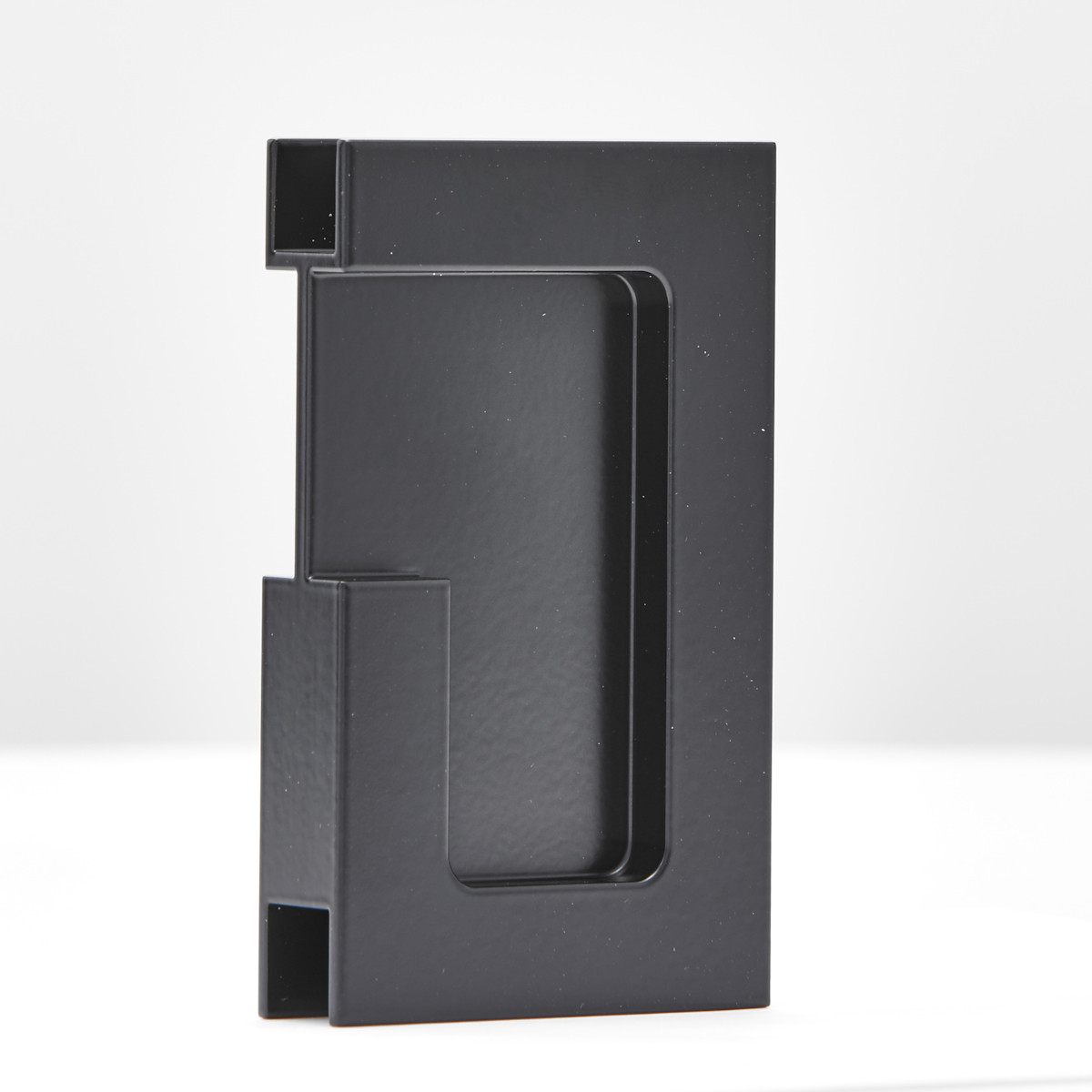 The CGP Glass Door Pull is unified, seamlessly merging the roles of two flush pulls and an edge pull. This contemporary pull, measuring 2 23/64 in [60 mm] by 3 15/16 in [100 mm], offers straightforward installation and presents a clean, minimalist aesthetic paired with easy-to-use functionality. This pull is available in flat black or satin stainless steel, with the option for custom finishing available.